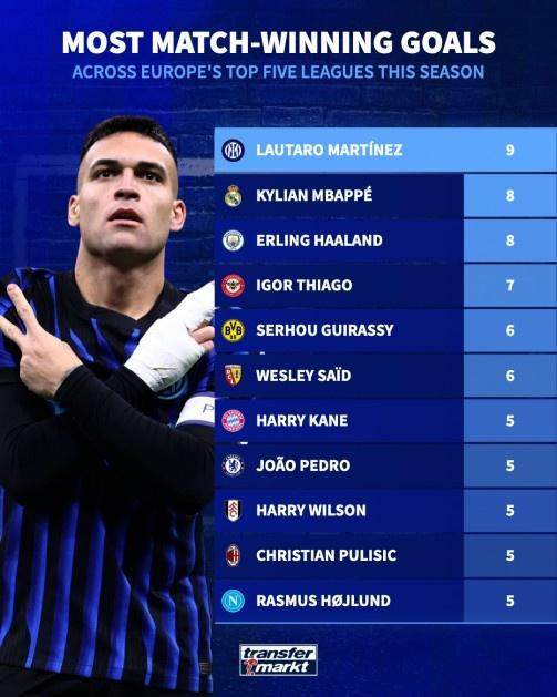 德国转会市场盘点了本赛季五大联赛打进制胜球球员情况,劳塔罗以9球居首,姆巴佩和哈兰德以8球并列次席。以下为具体排名情况:
